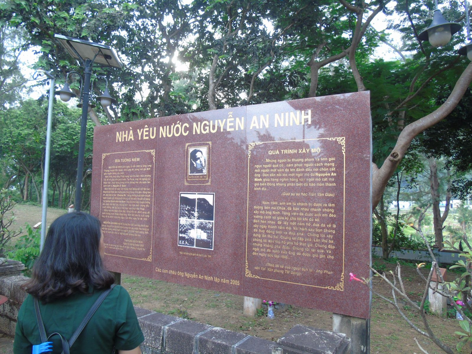 Nguyễn An Ninh là một nhà yêu nước chống Pháp hồi đầu thế kỷ XX. Nguyễn An Ninh không chỉ là nhà cách mạng, mà còn là nhà văn, nhà báo, nhà nghiên cứu, dịch giả. Con người thông minh, học thức, từng tốt nghiệp ngành Luật tại Đại học Sorbone danh giá của Pháp từ năm 1920, ông hoàn toàn có thể chọn cho mình một cuộc sống quan lại chức quyền dưới chế độ thuộc địa. Nhưng không, ông đã chọn con đường cách mạng và vào tù ra tội đến 5 lần. Lần cuối cùng bị lưu đày Côn Đảo, trong điều kiện sống thiếu thốn, bị hành hạ, ông đã qua đời tại đây khi mới 43 tuổi. Ông được an táng ở nghĩa trang Hàng Keo, sau mới dời về nghĩa trang Hàng Dương.