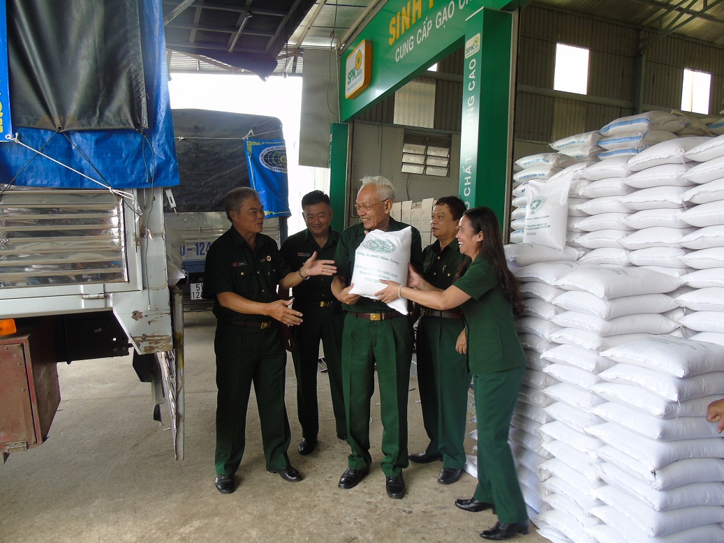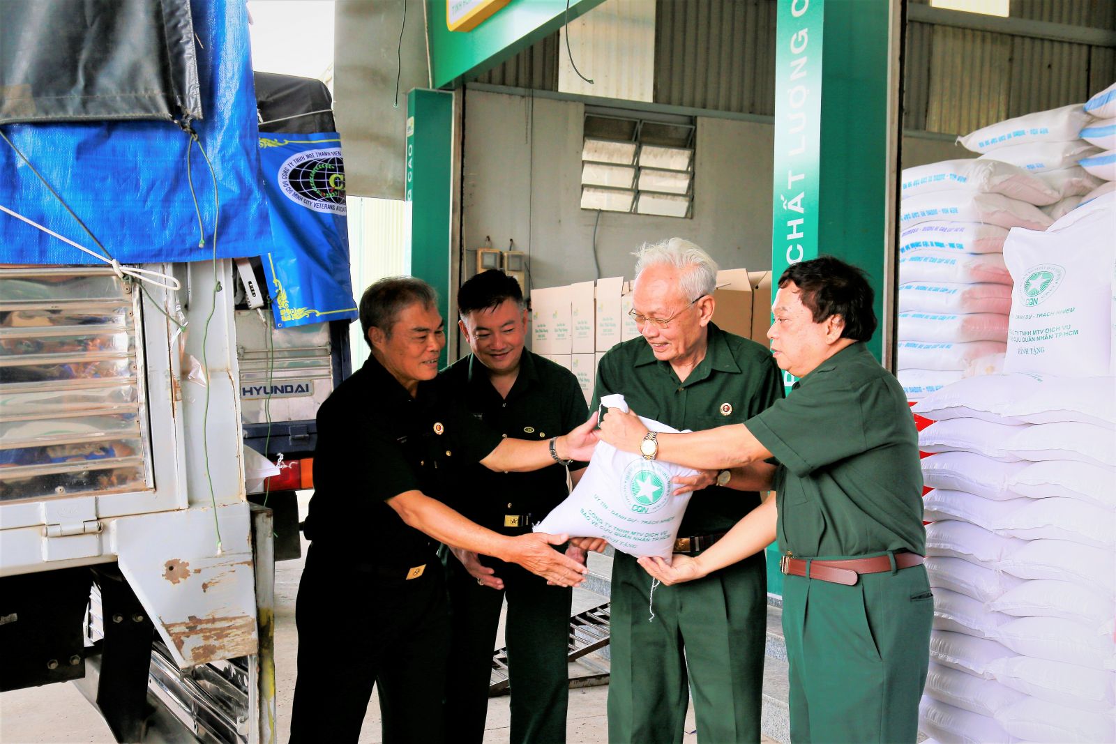 Ban lãnh đạo Công ty Cựu chiến binh chuẩn bị gạo đưa lên xe vận chuyển ra miền trung.