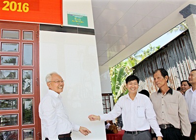 Chủ tịch Hội đồng quản lý quỹ hỗ trợ CCB nghèo Tp.HCM Lê Thành Tâm( trái) kéo bảng khánh thành Nhà đồng đội